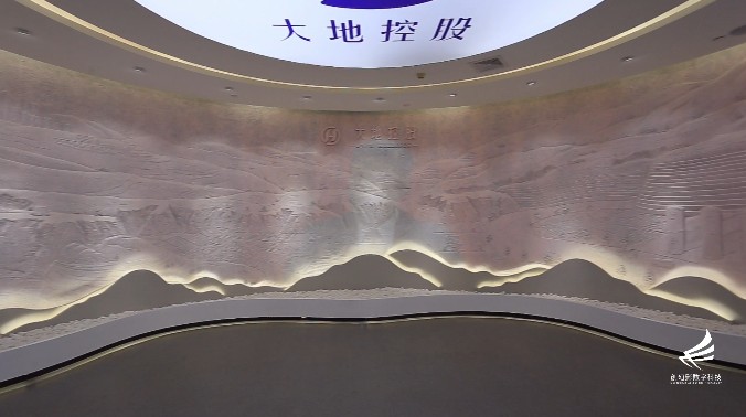 我們便進(jìn)入序廳部分,弧形的“綠水青山”浮雕墻氣勢雄渾,描繪著大美河山、和諧的生態(tài)自然環(huán)境,在結(jié)構(gòu)投影光電效果的加持下,浮雕畫面上投射的動(dòng)態(tài)影片,講述著人類生產(chǎn)生活對土地環(huán)境的破壞日益加劇,以改善自然環(huán)境為己任的大地集團(tuán)應(yīng)運(yùn)而生。